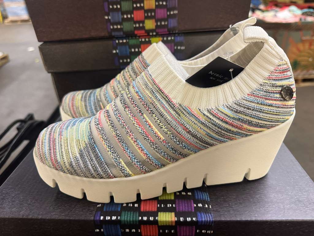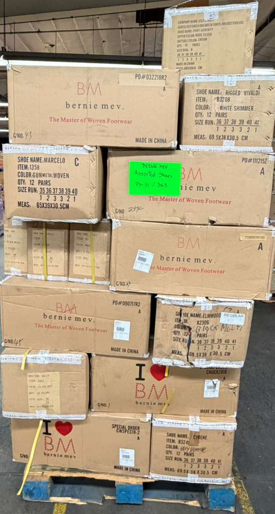 - This pallet includes 365 assorted pairs of Bernie Mev footwear, known for their lightweight comfort and modern designs. The assortment features a mix of casual, everyday, and fashion-forward styles in various colors and sizes. Ideal for resellers, boutiques, and online sellers, this high-quantity pallet offers excellent value and strong resale potential from a trusted comfort-shoe brand.