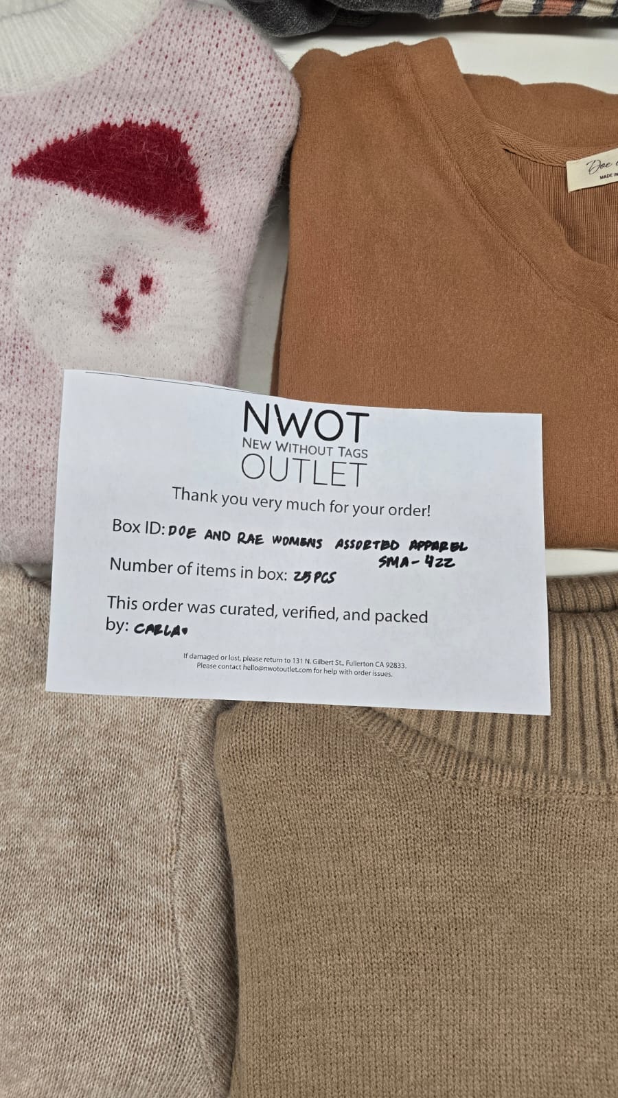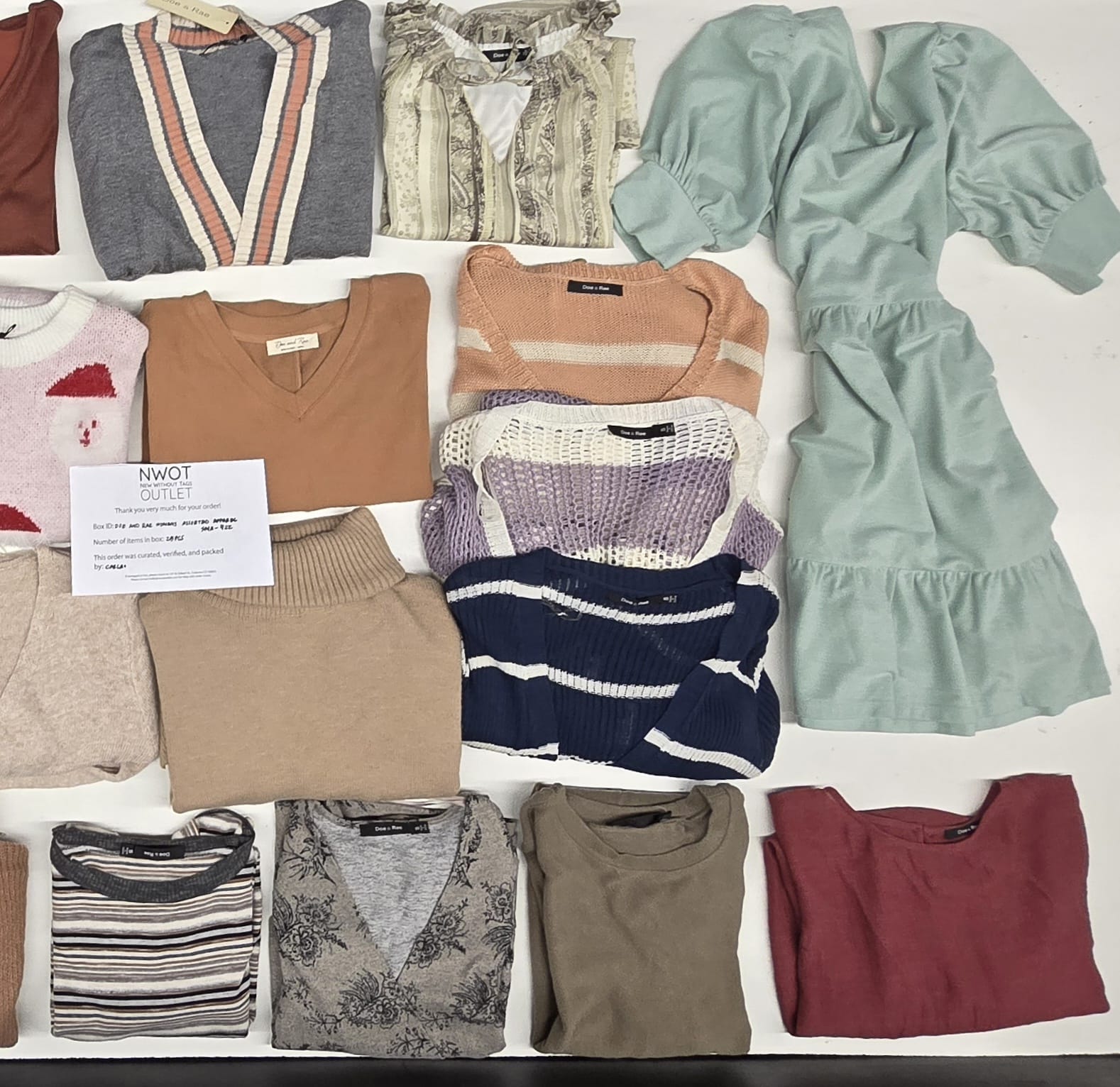 Styles: Includes 25 assorted pieces of women’s apparel from Doe & Rae. Expect a variety of stylish, on-trend designs, perfect for resellers or boutiques looking to add fashionable and versatile women’s clothing to their inventory.