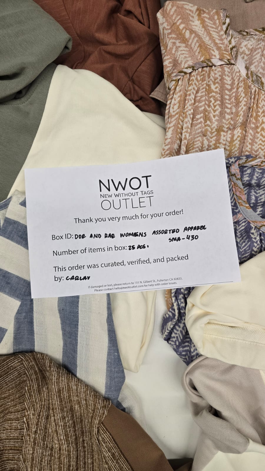 Styles: Includes 25 assorted pieces of women’s apparel from Doe & Rae. Expect a variety of stylish, on-trend designs, perfect for resellers or boutiques looking to add fashionable and versatile women’s clothing to their inventory.