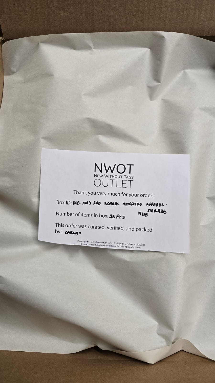 Styles: Includes 25 assorted pieces of women’s apparel from Doe & Rae. Expect a variety of stylish, on-trend designs, perfect for resellers or boutiques looking to add fashionable and versatile women’s clothing to their inventory.