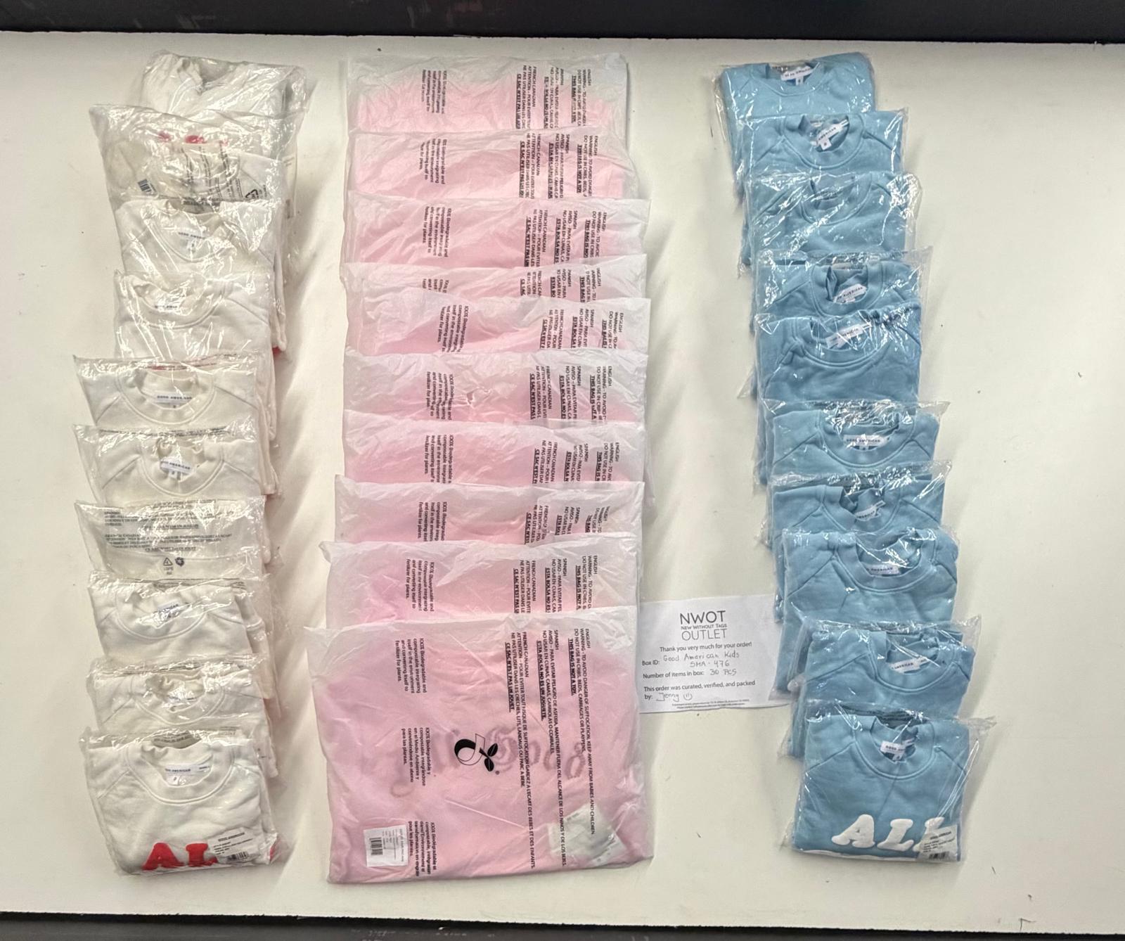Styles: Add stylish, brand-name children’s fashion to your inventory with this Good American assorted kids' apparel lot. This small box includes 30 assorted pieces, offering a mix of trendy and comfortable styles designed for everyday wear.